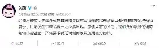 7月19日,就美团外卖使用清真食品箱一事,美团官方微博发表回应,“经调查核实,美团外卖在甘肃临夏回族自治州的代理商私自制作非官方配送箱和扇子,目前仅在甘肃临夏一地少量出现。”