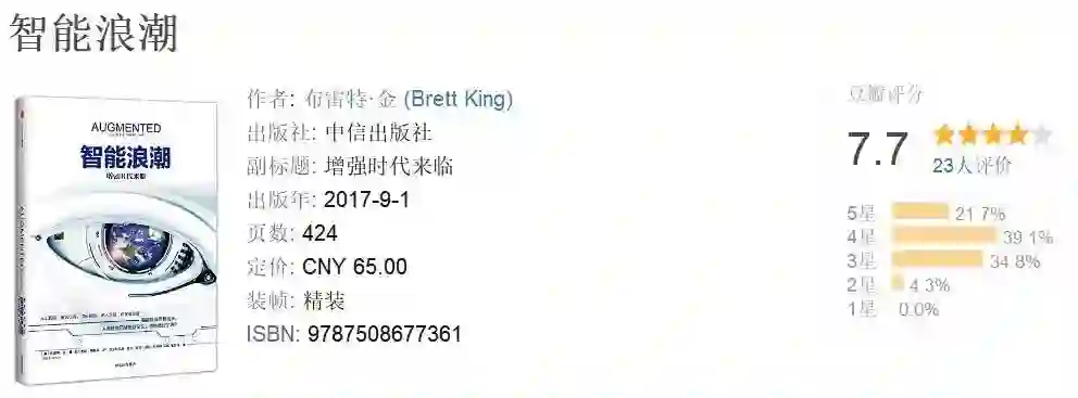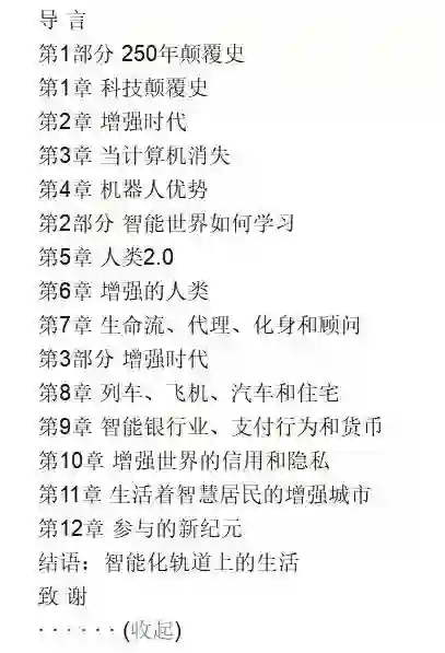 @alfred:这本书与一般的讲人工智能的书真的不一样。首先,它第一部分梳理了250年的科技进步历程,和讲述人工智能的断代史不同,这一本算是全史,通过阅读这一部分,人工智能在科技发展长河中的历史定位清晰展现出来了。第二部分和第三部分不仅讲述了人工智能在经济、金融、交通、医学、住宅、城市建设等社会各个领域的最新发展和应用,也讲述了人类该如何与人工智能相处。其全面性、深刻性是一般此类图书所不能比拟的。人工智能的书出的不少了,这一本不论从可读性上看,还是从前瞻性上看都是一本佳作。
