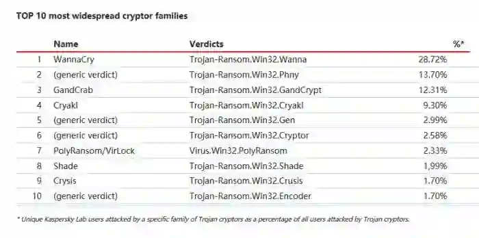 根据卡巴基斯的数据,WannaCry 占到了 28% 的勒索软件攻击。WannaCry 的幕后攻击者被认为是朝鲜的黑客组织。