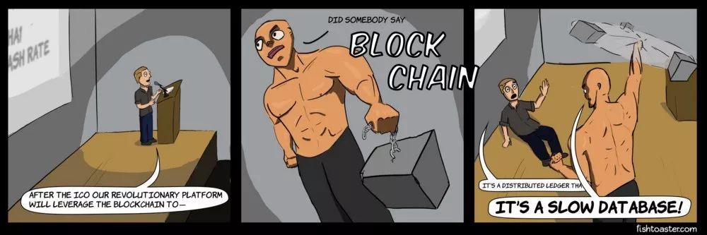 区块链是当今的一个流行术语;遗憾的是,“是区块链不是比特币”这个文化基因不会消亡。如果你提供的是集中式服务,区块链能做的事情集中式数据库都能做,而后者的成本只有前者的千分之一。如果你提供的是去中心化服务,那么你可能在自欺欺人,没有考虑到系统中存在的单一故障点。在真正去中心化的服务中根本没有“你”。