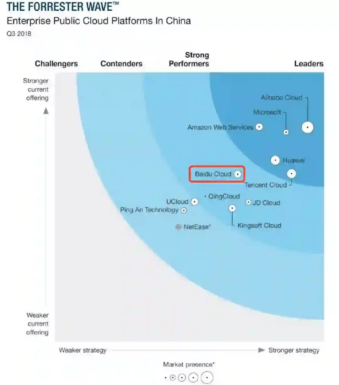 近日,知名调研机构Forrester发布《The Forrester Wave: Full-Stack Public Cloud Development Platforms In China, Q3 2018》。百度云因在收入增长和市场占有率两方面同时大幅增长而首次强势登陆 Forrester Wave卓越表现者(Strong Performer)象限。
