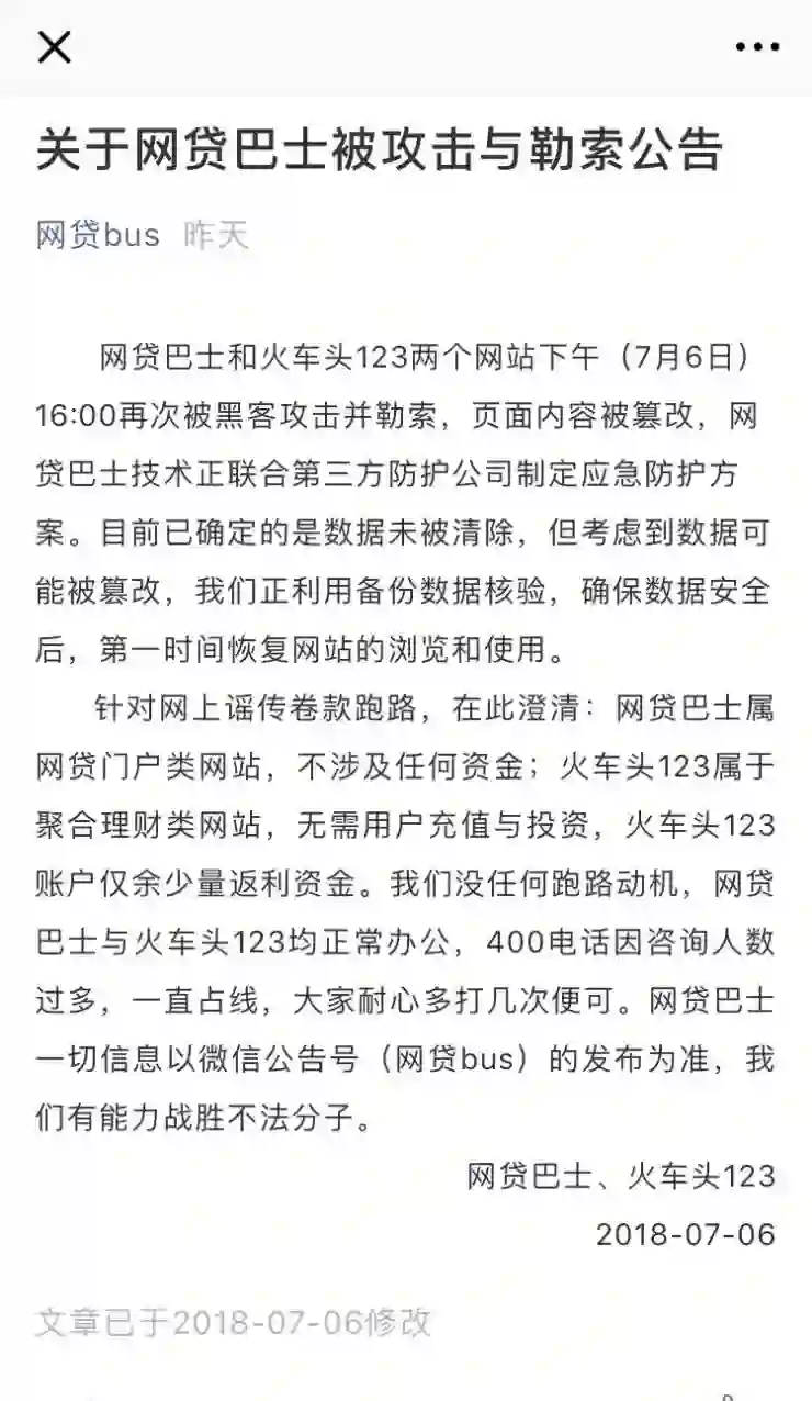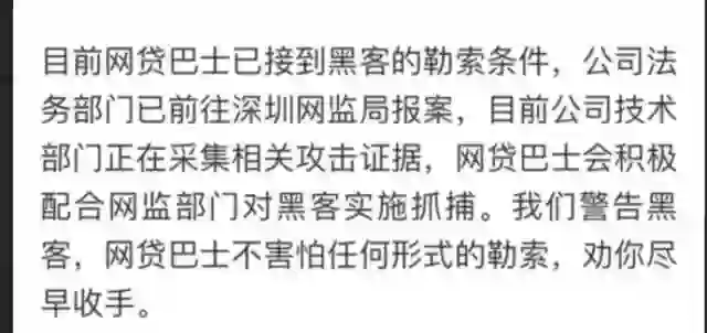 雷锋网消息,7月5日,网贷巴士在其官方微信公众号发文称网贷巴士官方网站遭黑客袭击,并且接到黑客的勒索条件。