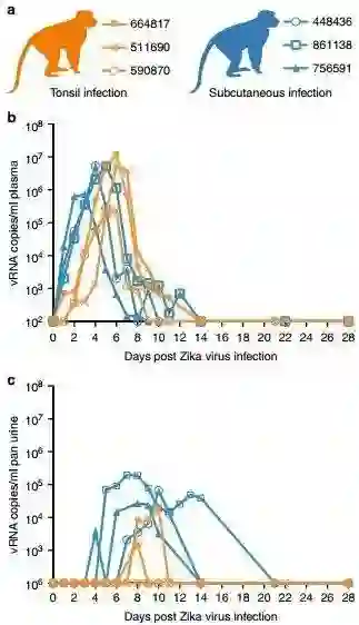 寨卡病毒RNA在皮下感染(蓝色)和扁桃体注射(橙色)的动物血液和尿液中的纵向检测。