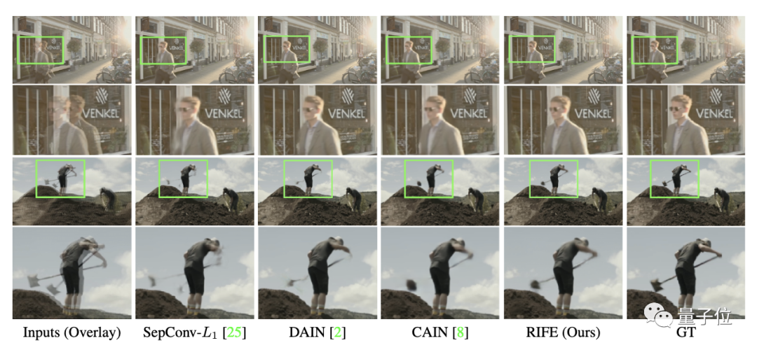 可以看到绿框部分,SepConv-L1和DAIN产生了伪影,而CAIN铲子部分则出现了缺失,相对而言,RIFE生成的结果更为可靠。