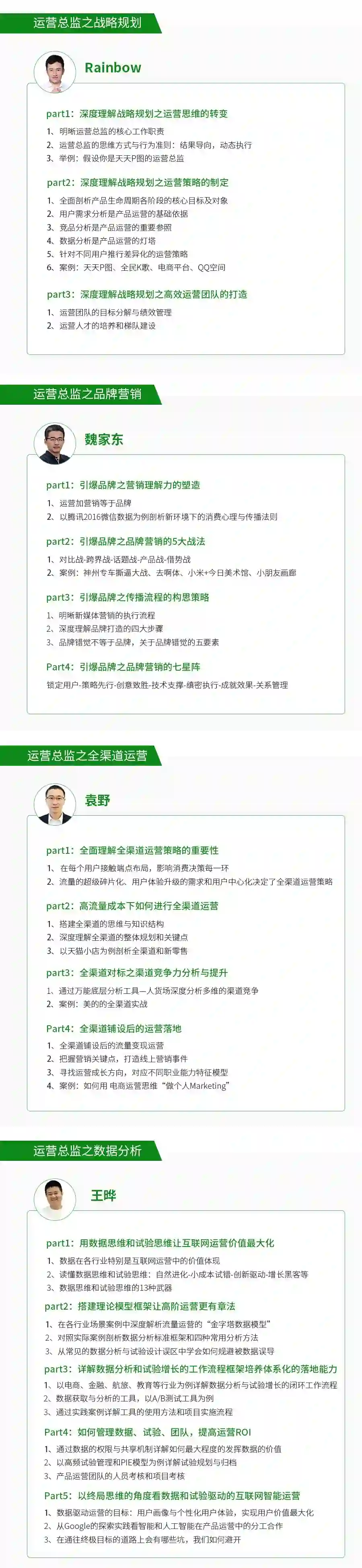 为了让所有3岁以上的运营经理能够更加充分理解并掌握能运营总监的能力模型,起点学院联合四位从业经验超过10年的实战派导师,将这套能力模型归纳为四大版块:战略规划、品牌营销、全渠道运营、数据分析。即运营总监修炼之道。