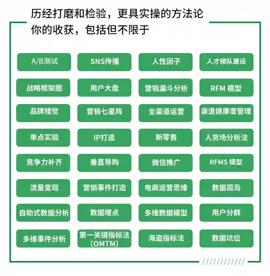 课程从四大版块阐述了运营总监必备的核心能力体系,在详解了系统思维框架之外精讲了多个行业运营战略的跨界打法和落地实操技能。