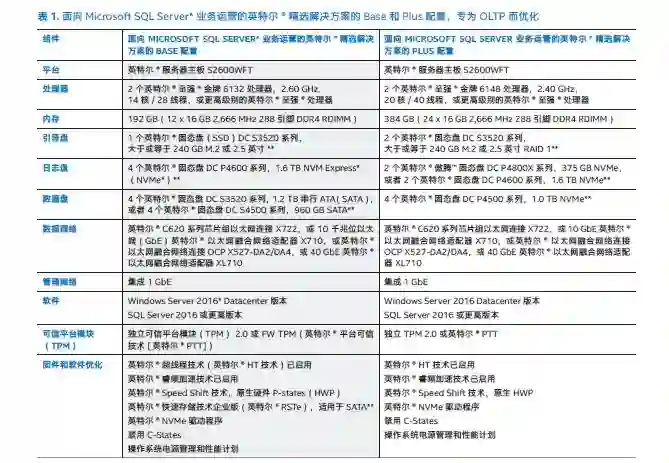 SSD正是英特尔面向SQL Server 精选解决方案的特长。该解决方案分为Base 和Plus 两种配置,都设置了专门针对日志层的存储,而且全部使用 英特尔数据中心系列SSD 固态盘,它们支持写入密集型环境,处理OLTP 工作负载时,可提供每分钟事务数所必需的高端性能。 作为引导盘和 数据层驱动器,这些固态盘DC 系列针对读取密集型和写入密集型的数据操作都有出色的性能。Plus 配置的所有驱动器均采用NVMe 固态盘,性能达到最佳。