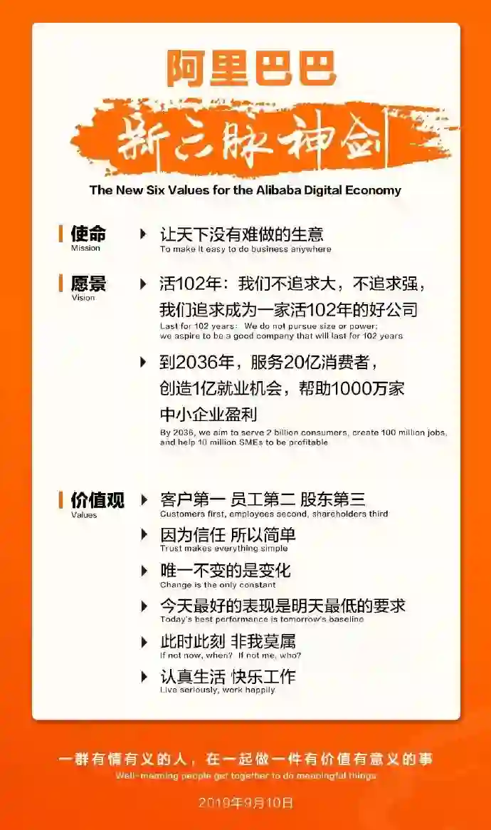 为此,在我们阿里二十周年之前夕,我们所有的合伙人、所有的组织部成员整个经济体的方方面面,大家花了无数的心血讨论,在二十周年之际隆重推出阿里巴巴价值观的升级,来推出我们新的“六脉神剑”: