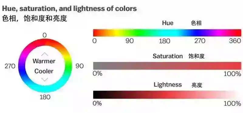 在数字图像中,一种呈现色彩的方法是将其分为三个属性:色相(色调)、饱和度和亮度。这被称作HSL色彩空间。