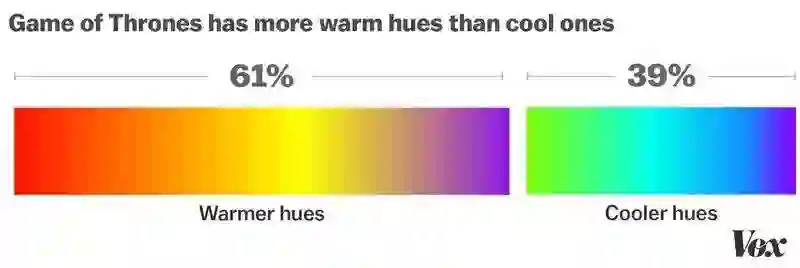 Vox网站分析了迄今为止所有66集里对色彩的使用——在剧集播出时,每隔10秒拍摄一次画面,并平均处理每张图里出现的颜色。结果发现:平均色彩是暖色的场景(也就是接近红色而非蓝色),多于冷色的场景。