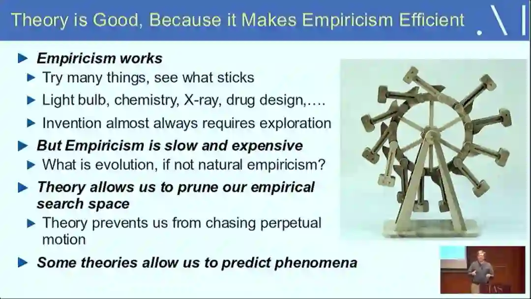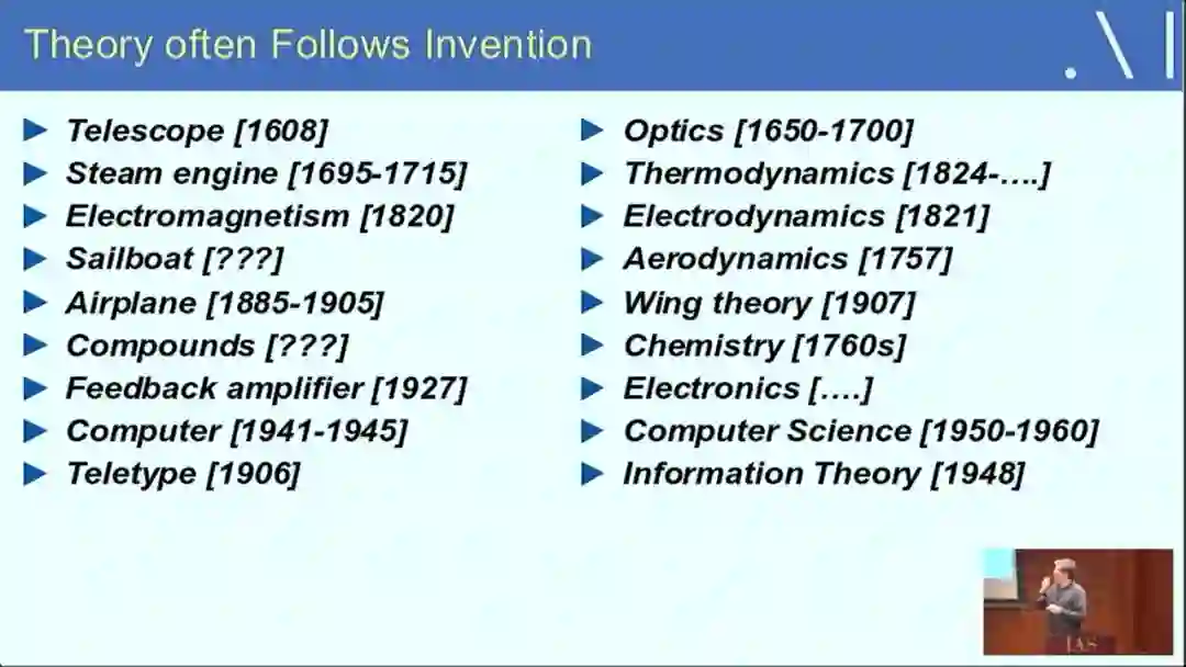 而理论往往是在发明之后构建起来的,比如:透镜的发明在光学理论之前,蒸汽机的发明在热力学之前,飞机在空气动力学之前,无线电通信再信息理论之前,可编程计算器在计算机科学之前。