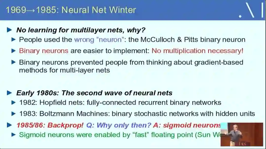 从 1969 到 1985 年,是深度学习的第一个 “冬天”。当时提出的多层网络并不学习,原因包括使用了错误的 “神经元”,而二元神经元阻碍了人们往 gradient-based 的方法去想。