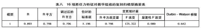 将两个量表采集的数据合并,以SPOC混合教学胜任力特征自测量表16个特征值作为自变量(预测变量),绩效评价表的得分为校标变量,进行复回归分析。在回归分析前先计算16个预测变量的积差相关矩阵,结果显示相关系数介于0.412至0.723之间,表示预测变量之间呈中低度相关;检测容忍度(Tolerance)值均在0.3左右,方差膨胀系数(VIF)均小于3.6(﹤评鉴指标值10),说明预测变量间只存在可忽略的轻微多元共线性问题,变量间的数据关系满足做回归分析的基本假定,表八是复回归的模型摘要表。