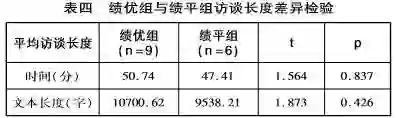 绩优组和绩平组的平均访谈时长及文本长度见表四,对两组访谈时间和文本长度进行独立T检验,结果显示两个组别没有显著差异(P>0.05),排除了访谈长度对两组胜任力分析的影响。