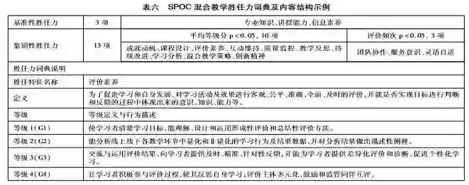 本研究最终所构建的SPOC混合教学胜任力模型包含3项基准性特征和13项鉴别性特征,并对每一项特征给予了定义和等级说明(见表六)。需要说明的是,胜任力词典初稿中部分特征项在访谈内容编码和分析结束后,其定义和等级描述得到了局部修正,以更准确地表达SPOC混合教学情境下的胜任力。