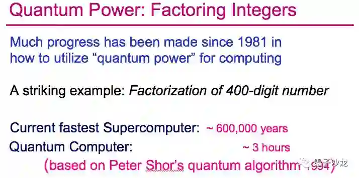 但是我给你一个400位的数字,让你计算出它的两个因数,你很难解出来。但事实上有个量子算法能解决这个问题,它是由Peter Shor在1994年提出。而且已经被证明,量子计算机能够非常快速的分解大数。