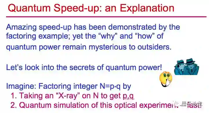 正如我前面提到的,“为什么量子计算机这么强大?它是如何做到的?” 外行仍然不能理解。所以我现在要谈到问题的核心。量子计算机是如何加速计算的?我接下来将介绍这个著名的量子算法:由Peter Shor发明的大数分解量子算法。