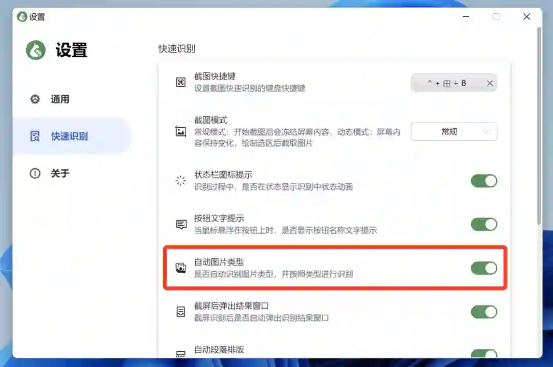 如果你平常截图识别的种类非常多,比如可能需要识别文字、表格、公式、二维码等,可以在设置里打开自动检测图片类型,软件会根据检测到的类型自动进行相应的识别。