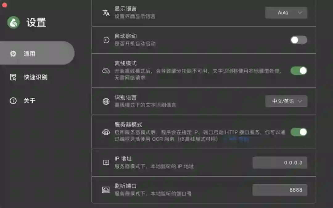 白描之前已经在 Mac App Store 中发布了 macOS 版本,此次又发布了一个新支持独立下载安装的版本,基本功能和上面介绍的 Windows 版本一样,同样支持截屏识别、文字识别、表格识别、公式识别、PDF 识别,不过它还有另一个功能:让你的 Mac 变成一个 OCR 识别服务器: