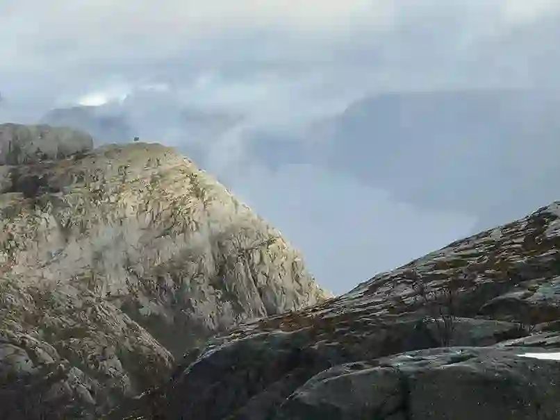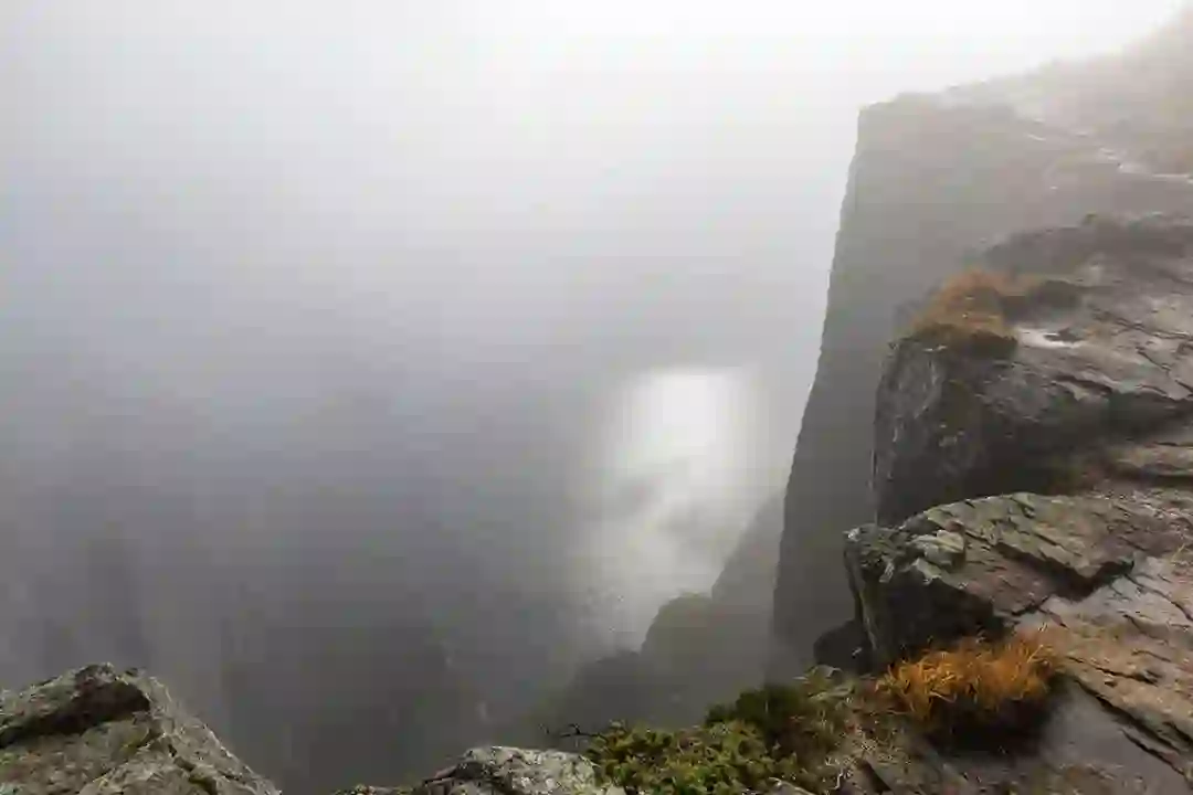 在我踩着溪水中溜滑的石头、攀过无数乱石、奋力爬上大石头坡、攀爬了两个小时、终于到达了山顶之后,只看到了迷雾,浓重的雾,把峡湾笼罩个严严实实,除了隐约的巨石影子,什么都看不见!看不见!