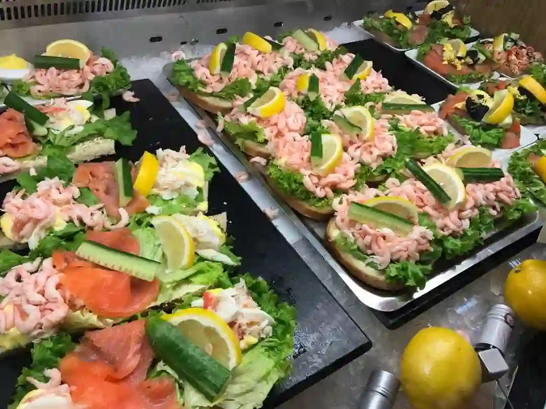 挪威盛产优质食材。挪威拥有绵延的海岸线和深不见底的峡湾,冰冷清澈的流水中,出产着优质的鱼类海鲜。气候寒冷,环境未受污染,适宜水果、浆果和蔬菜的生长,无需大量使用农药。在挪威期间,我多次品尝这种盖着一大堆新鲜虾仁的三明治,体验齿颊留香的美妙感觉。