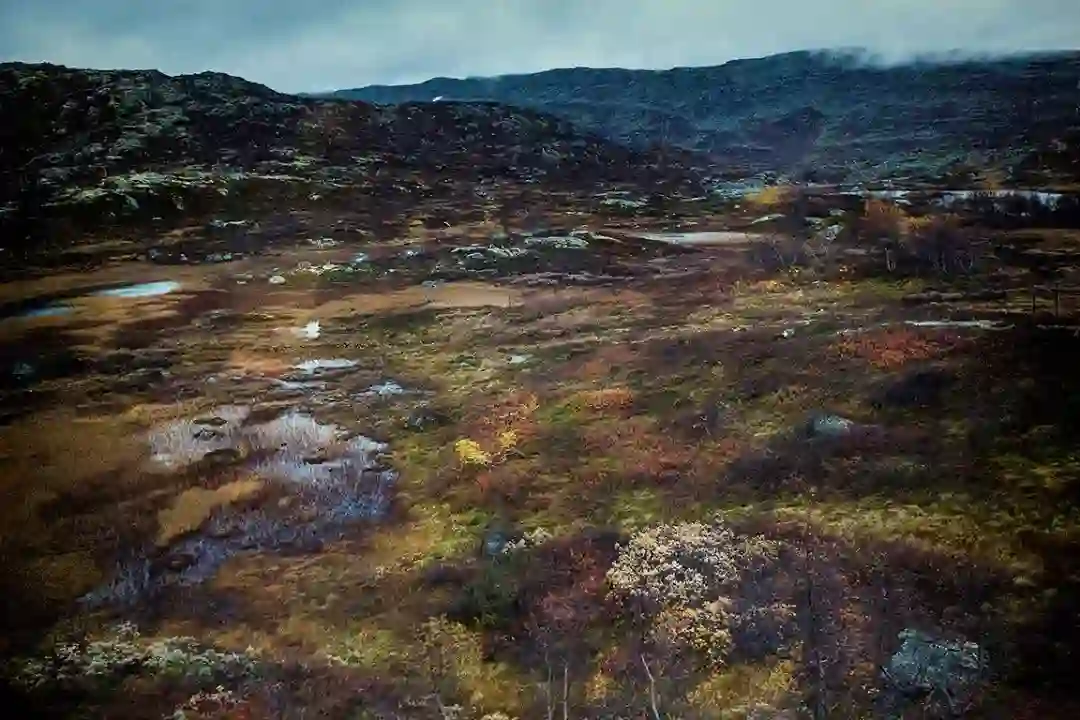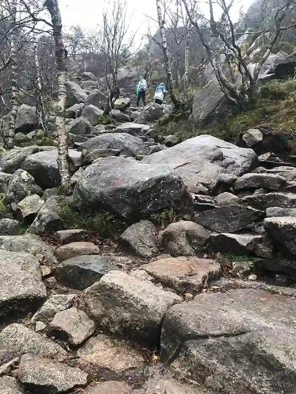 下山的路,更加艰难,密集的雨点打在脸上,流到嘴里,带着咸味,眼睛都睁不开。一路上,几乎完全是我一个人,在树林间、石头堆里、沼泽地中,跟着红漆的T 字路标,双手紧握手杖,一步步往前走,告诉自己:虽然没有看到摄人心魄的奇观,但也要去体会山林带来的心灵宁静、去记住在挪威独自行山的感觉。