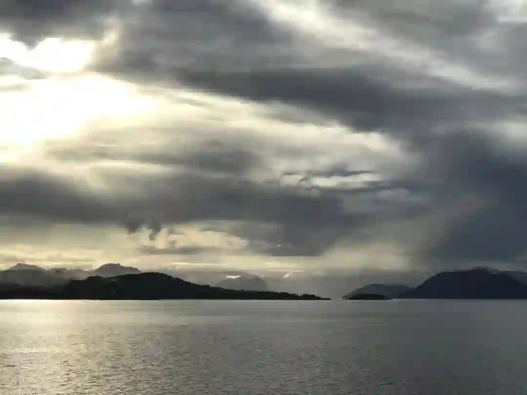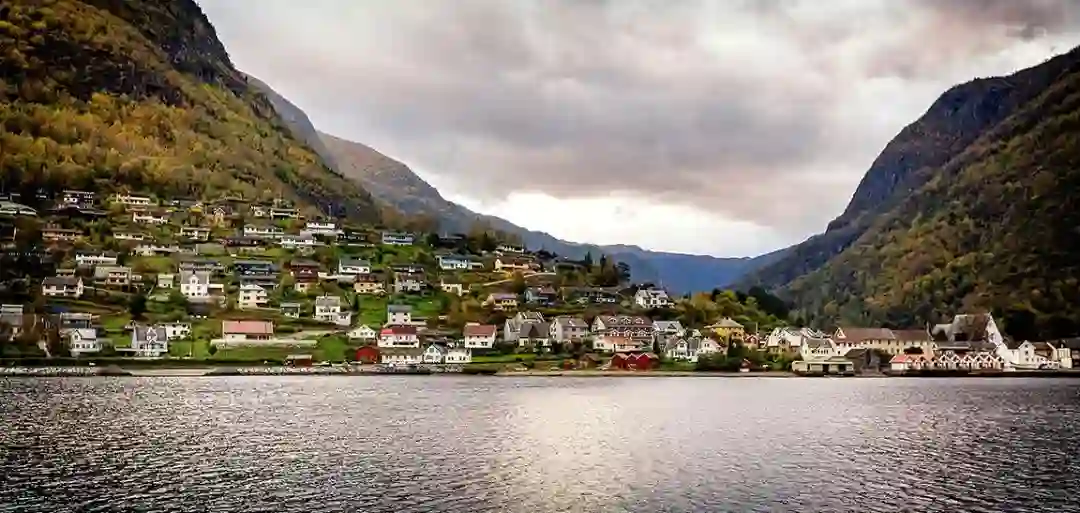 两岸时常出现彩色木屋村庄人家。阴云压顶,峡湾尽头氤氲缭绕,倒也别有风味。