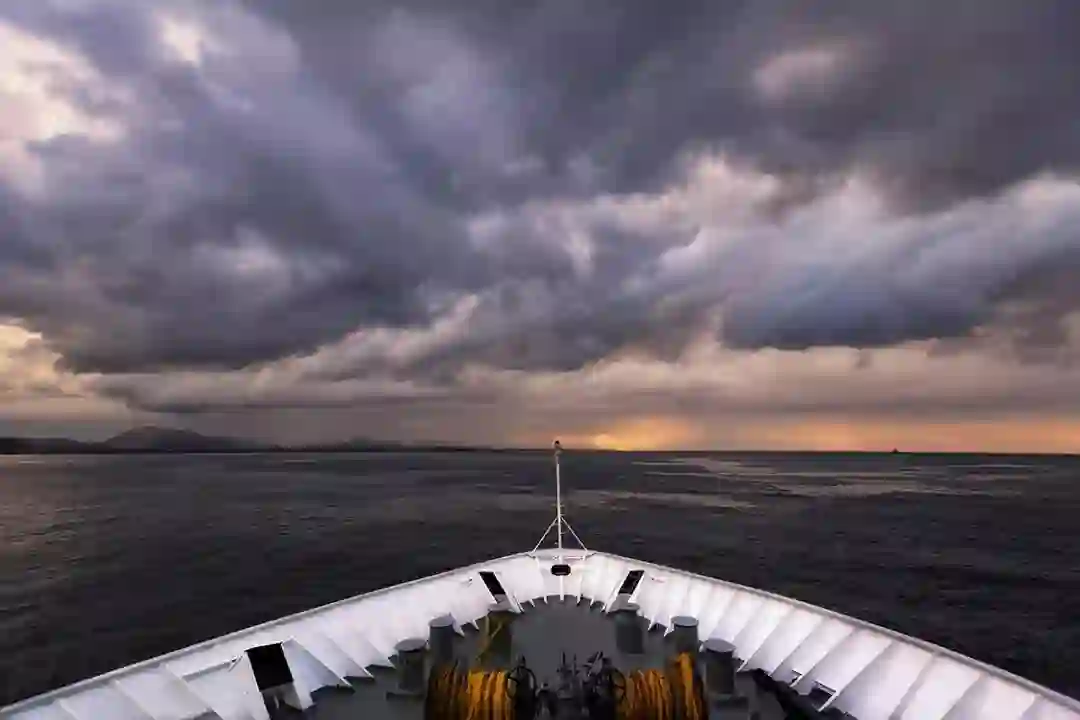 一夜的疾风骤雨,船一直剧烈摇晃,外面风浪不知多大。人睡在床上,上下左右地摇晃,像一局麻将中的牌被搓来搓去。第二天早起期待日出,但仍然是乌云密布,阵雨密集。
