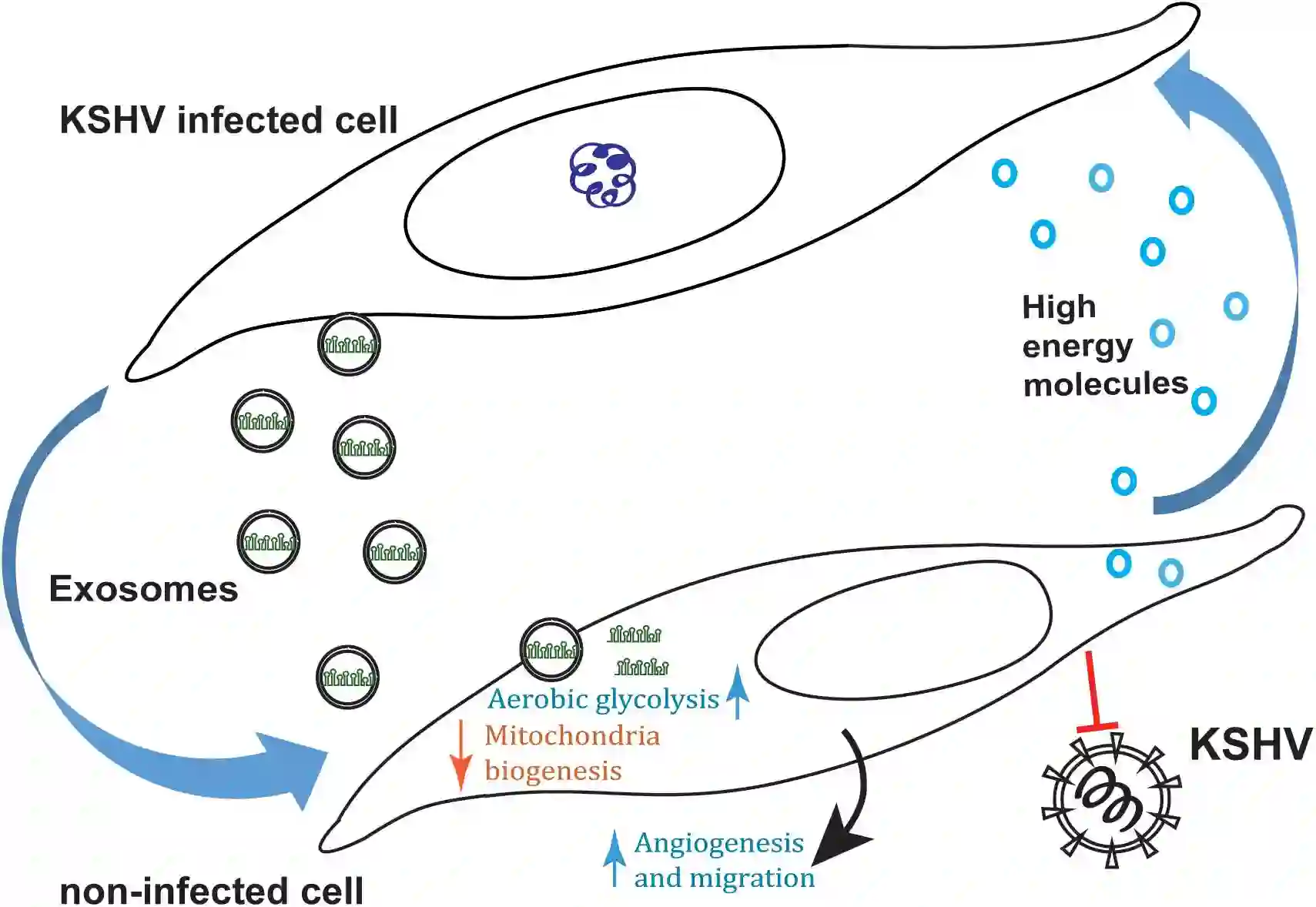 卡波西肉瘤疱疹病毒(KSHV)是卡波西肉瘤(Kaposi’s sarcoma,KS)和某些淋巴样肿瘤的病原体。 KS是HIV-1感染中最常见的肿瘤,并且在其他免疫抑制个体(例如器官后移植后)以及KSHV感染特异性的群体中能够产生较高的发病率。迄今为止,KSHV感染没有有效的治疗,需要新的治疗方法。 卡波西肉瘤细胞有着与其他癌症明显不同的代谢特点,而且KSHV病毒能够改变宿主细胞中的一些代谢途径。KSHV病毒感染细胞以及细胞与微环境之间的相互作用对于原发性渗出性淋巴瘤的生长非常重要。最近显示,KSHV miRNA存在于从KS患者和KS小鼠模型分离的外泌体中,但是在KS生物学中的作用仍然是未知的。