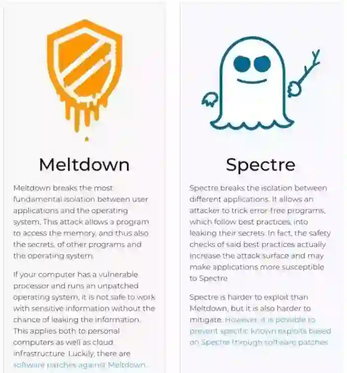 这两个漏洞一个是Meltdown,它影响了英特尔的处理器;另一个是Spectre,它影响了英特尔、AMD以及ARM的芯片。