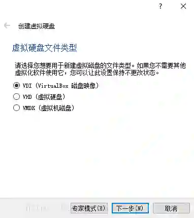 选择默认的 VDI 硬盘文件类型