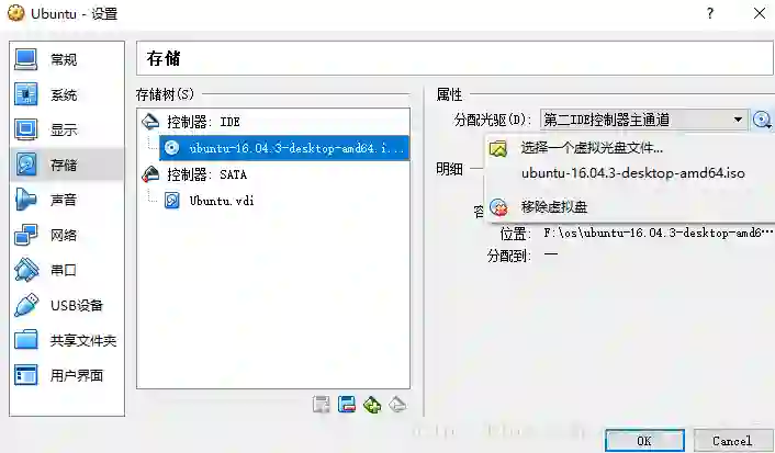 然后选择刚才创建的 Ubuntu 系统,点击设置,这系统中取消勾选软驱,然后点击存储,选择 Ubuntu 镜像,笔者使用的是 64 位 Ubuntu 16.04 桌面版的镜像