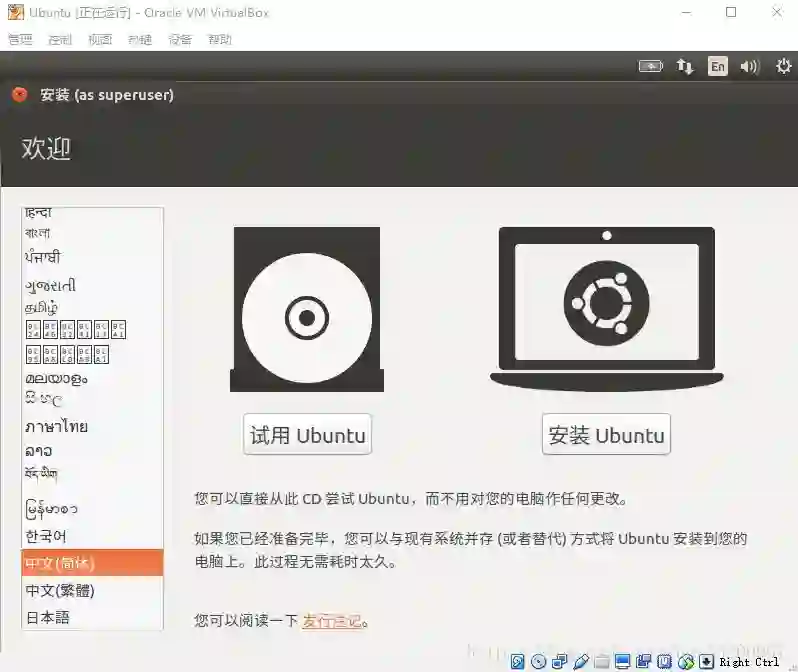 最后就可以启动安装 Ubuntu 了。选择我们创建的 Ubuntu 系统,点击启动,进入到开始安装界面,为了方便使用,笔者选择中文版的