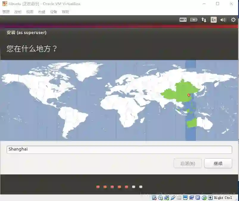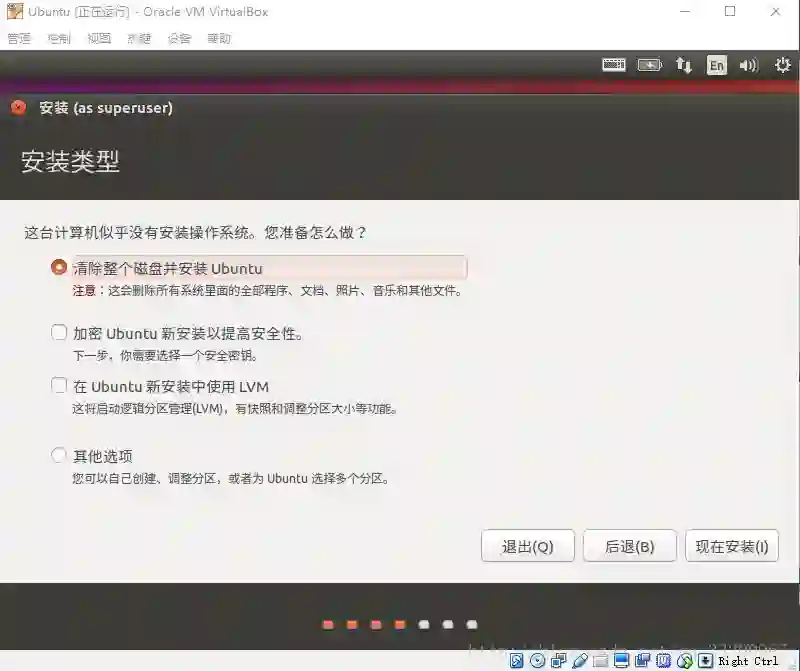 然后是选安装的硬盘,因为我们使用的自己创建的整一个硬盘,所以我们可以直接选择青春整个硬盘并安装 Ubuntu,这里就不用考虑分区和挂载问题了