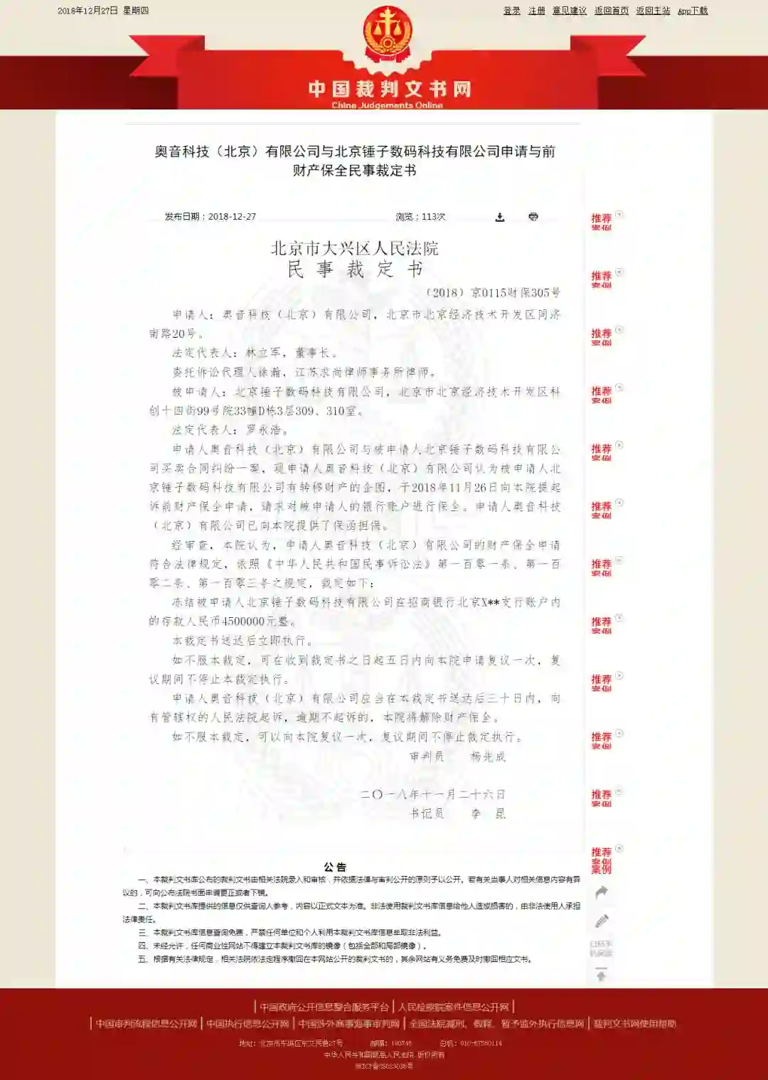 12月27日上午,因怀疑有转移资金的企图,锤子科技被奥音科技(北京)有限公司申请诉前财产保全,法院裁定将冻结锤子科技在招商银行的存款人民币450万元整。