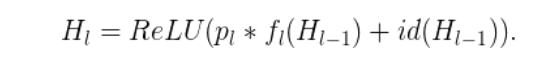 如果p_l表示的是第l层在训练中的生存概率,那么在测试过程中,我们就能得到以下的方程式: