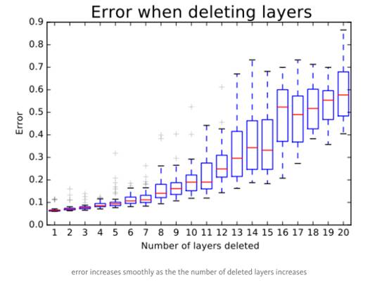 [10]一文的作者们提出了一个训练一个深度网络的“反直觉”方法,即在训练中任意地丢弃网络的层,并在测试中使用整个网络。Veit等人[12]介绍了一个更加“反直觉”的发现:我们可以删除经过训练后的ResNet中的部分层,同时保持相当不错的网络性能。这样一来ResNet架构就变得更加有趣了,因为在Veit等人的论文中,作者对VGG网络做了同样的操作,移除了一个VGG网络的部分层,而VGG网络的性能出现了显著的退化。