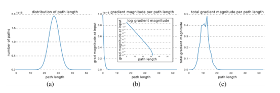 我们现在可以将每一路径长度与其期望的梯度大小相乘,看每一路径长度在训练中起到多大的作用,就像(c)图。令人惊讶的是,大多分布都来自于9到18的路径长度,但它们都只包含少量的总路径,如(a)图。这是一个非常有趣的发现,因为这暗示着ResNet无法解决过长路径的梯度消失问题,ResNet的成功实际上源自于它缩短了它的有效路径(effective path)的长度。