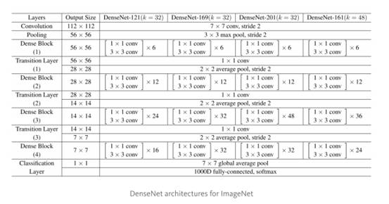根据这种范例,我们知道第l层输入feature map的数量会有k*(l-1)+k_o个,其中的k_0是输入图像中的通道数目。作者们使用一个叫做“增长率”(k)的超参数防止网络变得过宽,他们还用了一个1*1的卷积瓶颈层在3*3卷积前减少特征映射的数量。整体架构如下表所示: