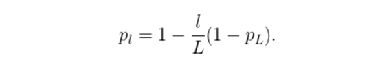 作者们将一个“线性衰减规律”应用于每一层的生存概率,他们表示,由于较早的层会提取低级特征,而这些低级特征会被后面的层所利用,所以这些层不应该频繁地被丢弃。这样,最终生成的规则就变成了这样: