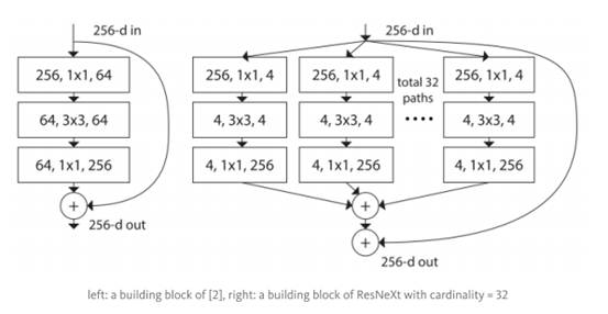 左边是[2]中所提到的残差块;右边是基数为32的ResNeXt构件