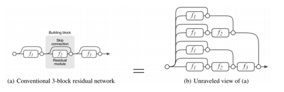 为了使训练过程更清晰易懂,Veit等人首先介绍了一个ResNet的分解图。当展开这个网络架构以后,我们就能很清楚地发现,一个有着i个残差块的ResNet架构有2**i个不同的路径(因为每一残差块会提供两个独立的路径)。