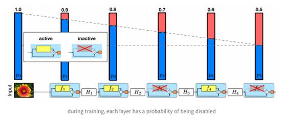 从形式上来看,H_l是第l个残差块的输出结果,f_l是由l第l个残差块的权重映射所决定的映射,b_l是一个Bernoulli随机变量(此变量的值只有1或0,反映出一个block是否是被激活的)。具体训练过程如下: