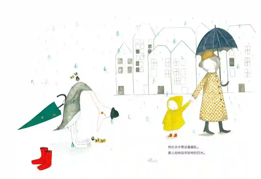 鸟先生是一个很特别的人。一到下雨天,他就会收起雨伞,伸出长长的嘴巴,去接雨滴。