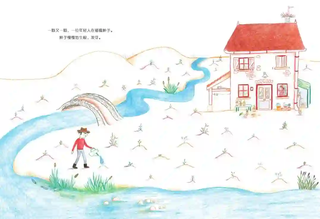 小男孩在一片土地上,种下了很多种子,他一天天的陪伴着种子生根、发芽。