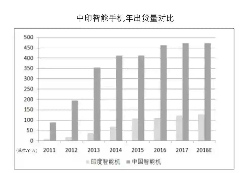 以印度为例,2017年,其智能机市场增长14%,达到1.22亿部,已成为仅次于中国的全球第二手机市场。而据Counterpoint Research的统计数据显示,13.2亿的印度人口中,约有6.5亿人使用手机,大约三分之二的印度手机用户(约合4.3亿人)计划在2018年升级其手机。这意味着在4G通讯普及和经济增长的助推下,其智能手机市场仍将迎来巨大增长空间。