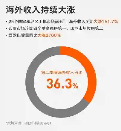 小米作为其中的佼佼者,Q2季度成绩不俗。小米该季度海外收入达164亿元,同比增长151.7%,占比达36.3%。其中在印度市场取得按出货量计市场份额和增速双料第一;在印尼轻取增速冠军、出货量亚军;其西欧出货量同比暴增2700%,在全球25个国家和地区跻身市场前五。
