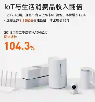 与此同时,小米还实现AI+IoT的双轮驱动。今年6月,其宣布开源自主研发的移动端深度学习框架Mobile AI Compute Engine (MACE),为国内AI产业赋能。而其智能音箱业务借助语音交互技术,在IoT生态中扮演着中枢作用。据最新官方数据显示,截至2018年7月底,小爱同学月活跃用户超过3000万人,累计唤醒次数超过50亿次,仅7月唤醒次数就超过了10亿次。小米AI的爆发式增长,结合小米全球领先的IoT平台,将带来新的想像空间。