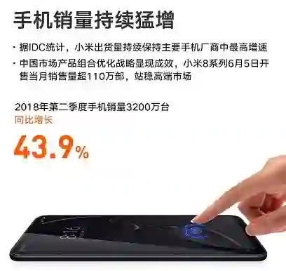 受此推动,小米手机整体出货量和平均售价均有不俗表现。2018年Q2,小米出货量达3200万部,同比增长43.9%,以305.01亿元收入同比大涨58.7%。这也得益于小米8系列、MIX2S等旗舰机的强劲销量,手机平均售价同比增长超过25%,在高端机型市场上表现优异。