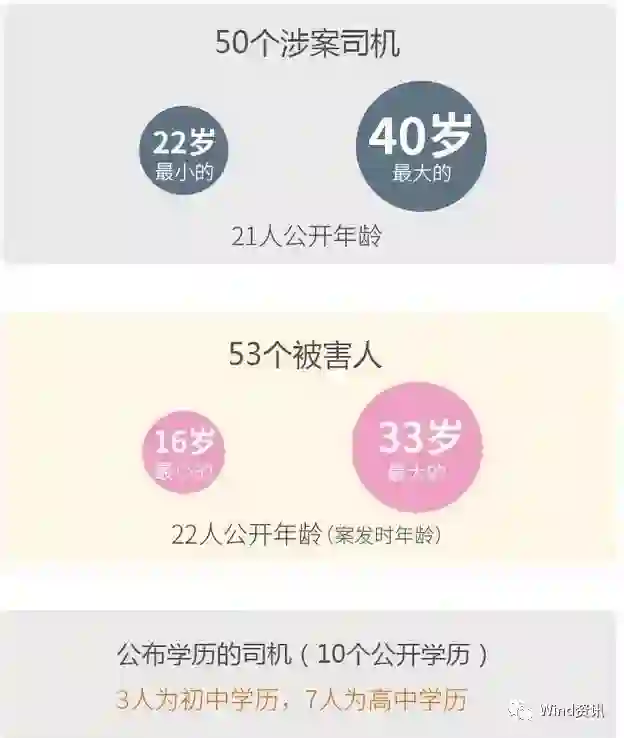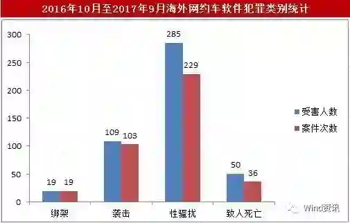 Wind梳理公开数据发现,仅2016年10月至2017年9月发生的与海外网约车软件相关的侵害案件,就导致109人遭袭击、19人遭绑架、50人死亡,另有285人遭到性骚扰。